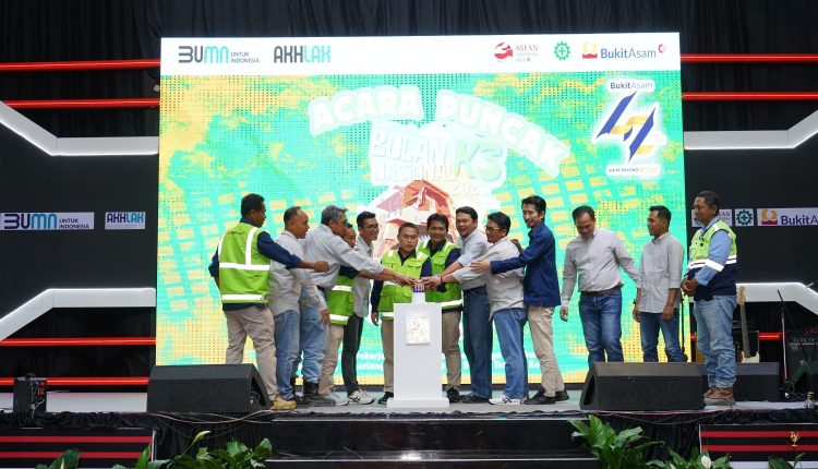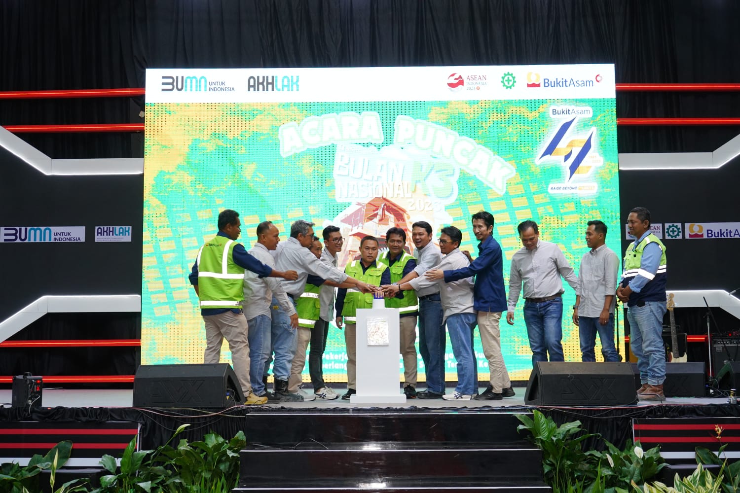 MUARAENIM,BS – PT Bukit Asam Tbk (PTBA) menggelar acara puncak sekaligus penutup rangkaian kegiatan Bulan Keselamatan dan Kesehatan Kerja (K3) Nasional tahun 2023 di Gedung Serba Guna (GSG) Tanah Putih, Tanjung Enim, Selasa (14/2/2023).