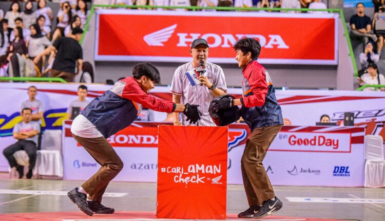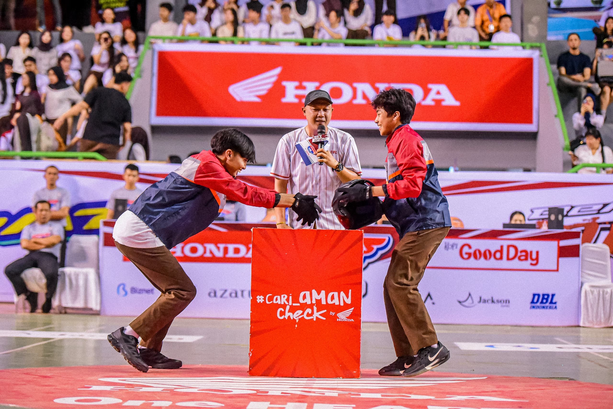 Tak hanya di booth, Astra Motor Sumsel juga menghadirkan kejutan seru di sela-sela pertandingan. Melalui Honda #Cari_Aman Check, para penonton berkesempatan mengikuti games interaktif yang mengedukasi pentingnya keselamatan berkendara. Pemenang berhak mendapatkan berbagai kelengkapan safety riding dari Honda, mulai dari helm, jaket, hingga sarung tangan.