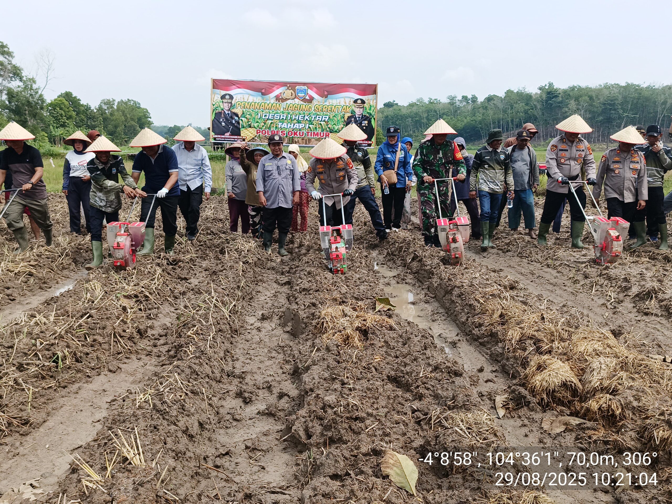 OKU TIMUR, BS — Dalam rangka memperkuat ketahanan pangan pada pembangunan pertanian untuk menuju Indonesia Emas tahun 2045. Polsek Buay Madang Timur (BMT) Polres OKU Timur melaksanakan penanaman jagung serentak 1 Desa 1 Hektar Lahan.