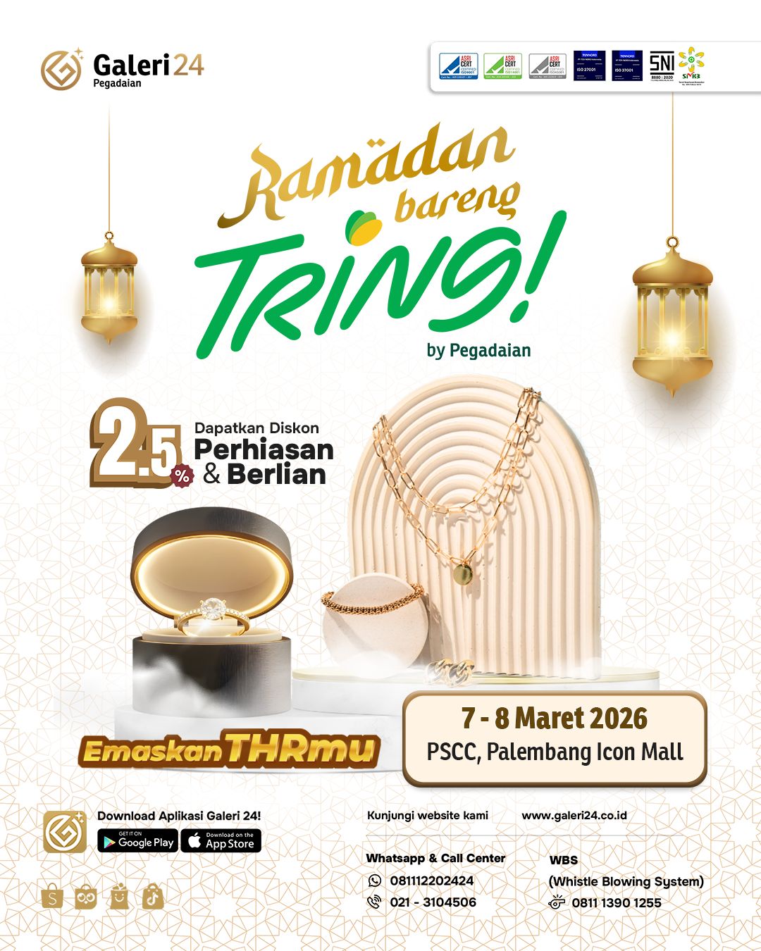 KOTA PALEMBANG, BS – Dalam rangka menyemarakkan bulan suci Ramadan 1447 H, Pegadaian Kantor Wilayah III Palembang akan menggelar kegiatan bertajuk “Ramadan Bareng TRING! by Pegadaian” yang dilaksanakan pada 7–8 Maret 2026 di PSCC Icon Mall Palembang.
