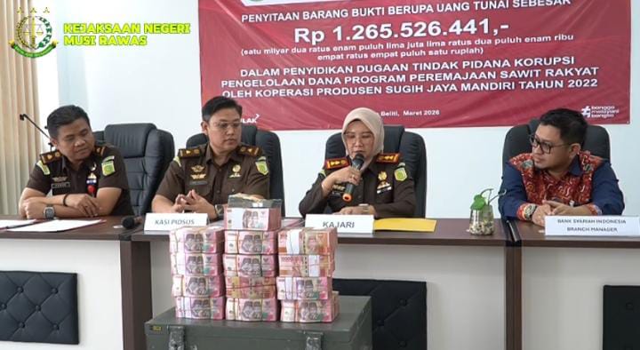 MUSI RAWAS, BS — Kejaksaan Negeri (Kejari) Musi Rawas menyita uang tunai sebesar Rp 1.265.526.441,- dalam perkara dugaan tindak pidana korupsi pengelolaan dana Program Peremajaan Sawit Rakyat (PSR) oleh salah satu koperasi produsen di wilayah tersebut.